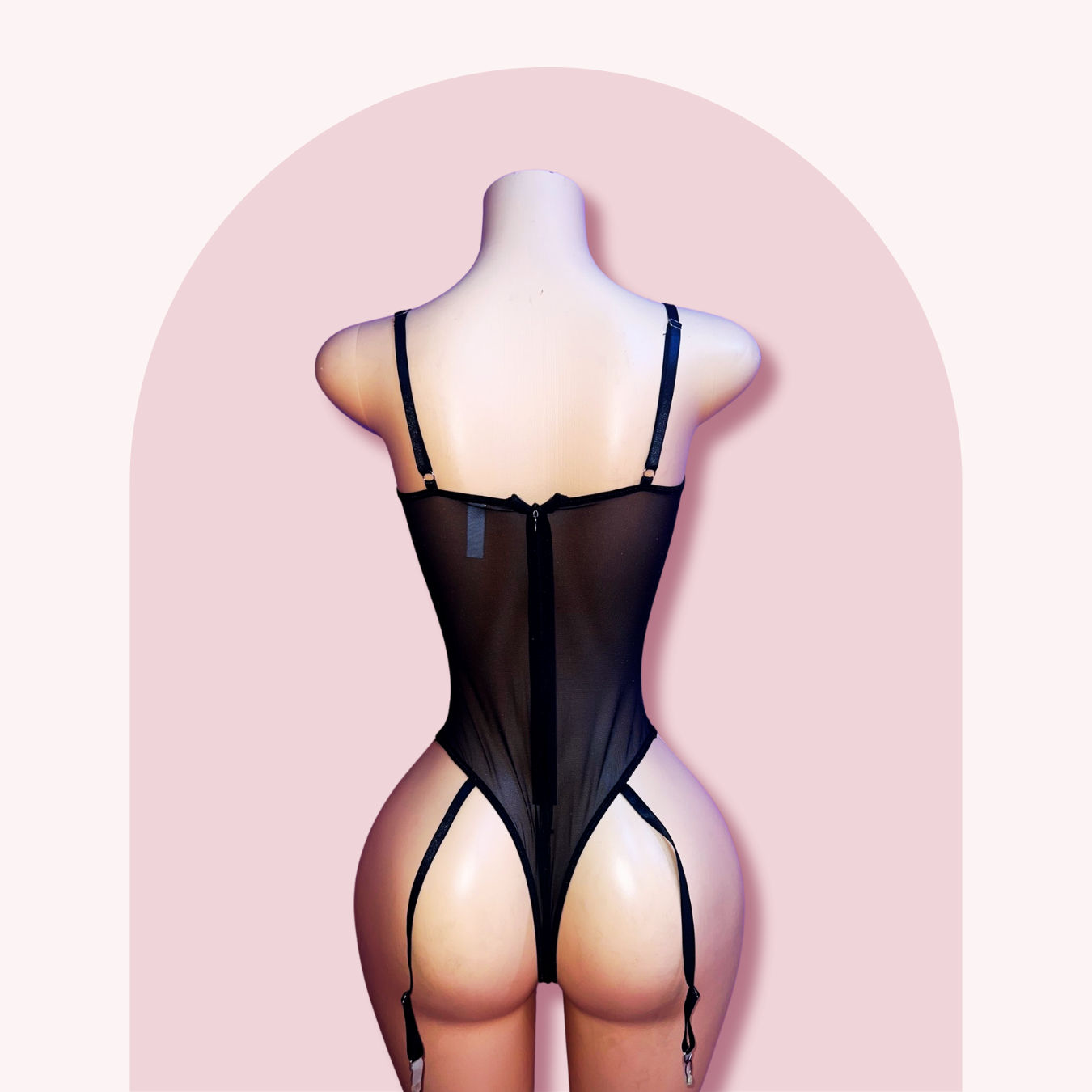 Featuring a sleek black design with sheer mesh panels and a lace-up front detail, this corset bodysuit offers a sultry silhouette. Ideal for lingerie wear or pairing with statement outerwear for a night out.
